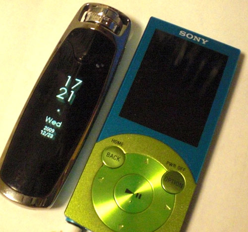 NW-S645とNW-S706Fを並べた写真が3枚目。長さは似たような感じですが、片やコロンとした概観で実際の表示は横(時計は縦に出てるけど)、片やipod風なデザイン。