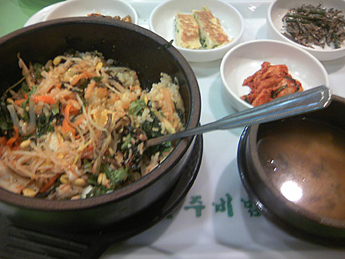 朝っぱらすぎて(つっても11時だよ)どこも食べ物屋が開いてなさそうなのでファッションビルの上にあるフードコートへ行き石焼ビビンバを食す。