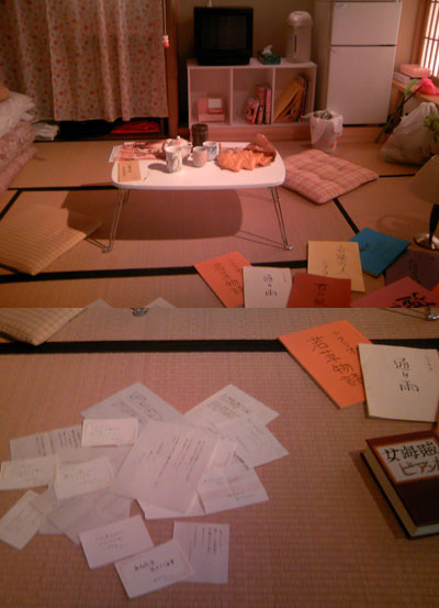 マヤの部屋には各種台本やらスーパーの袋やら(野菜はすぐに冷蔵庫に入れろ)が転がっているんですが、台本の隣りに散らばっているのは、そうです、紫のバラに添えられていた手紙です!